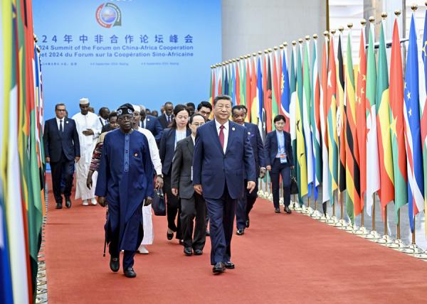 9月5日上午,国家主席习近平在北京人民大会堂出席中非合作论坛北京峰会开幕式并发表主旨讲话。习近平宣布,中国同所有非洲建交国的双边关系提升到战略关系层面,中非关系整体定位提升至新时代全天候中非命运共同体,将实施中非携手推进现代化十大伙伴行动。