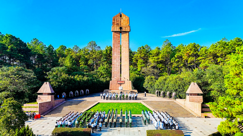 在深情庄重的《献花曲》伴奏下,礼兵抬着花篮缓步走向烈士纪念塔,向革命烈士敬献花篮。花篮红色缎带上书写的“烈士永垂不朽”熠熠生辉。